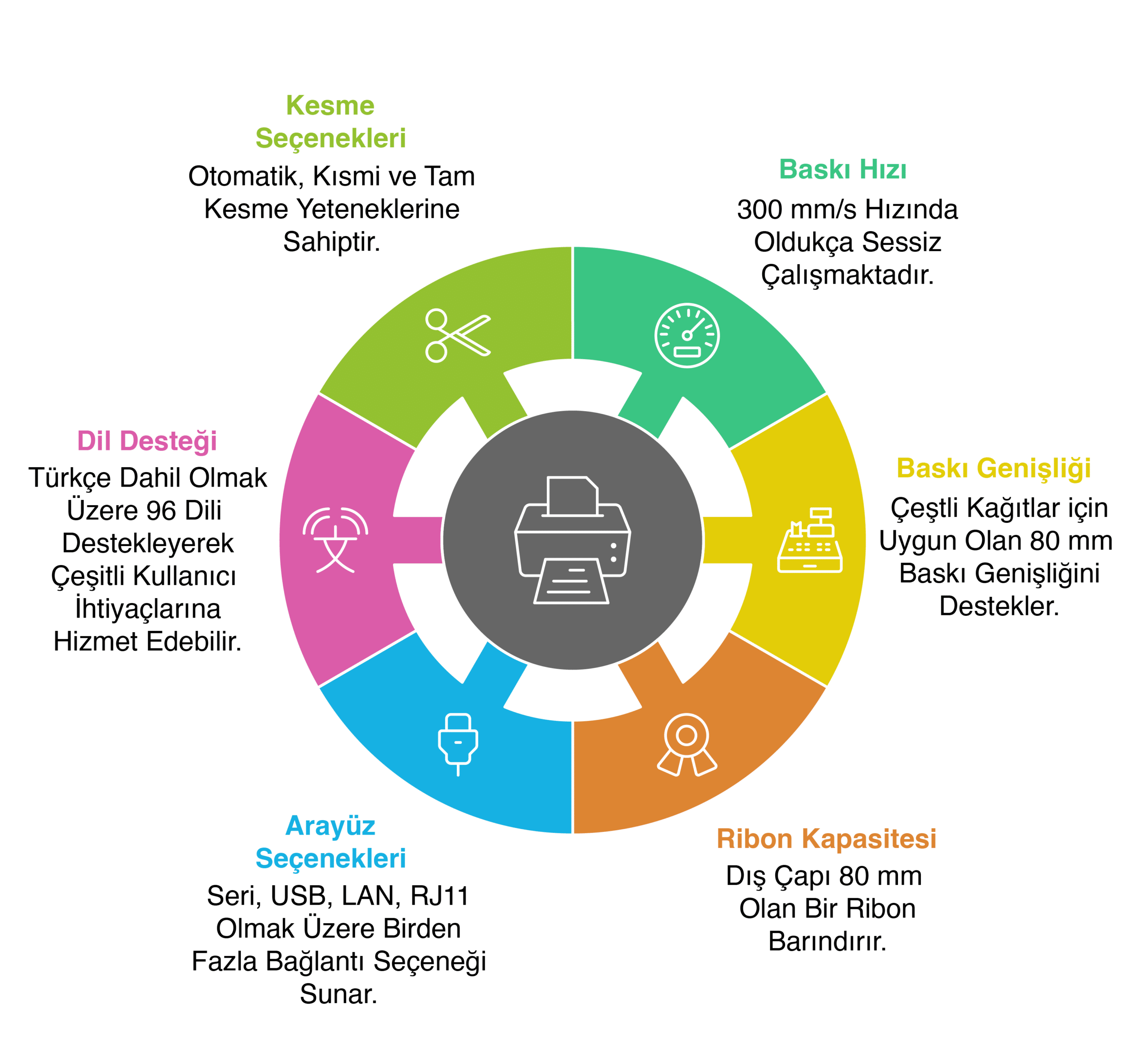 Kullanımı kolay yapılandırma menüsü ve sürücü desteği ile hem Windows hem de Linux tabanlı sistemlerle uyumlu çalışabilir. Kompakt boyutları, dar alanlara rahatça sığmasını sağlarken, dayanıklı yapısı uzun ömürlü kullanım sunar. Ayrıca enerji verimliliği sağlayan tasarımı hem çevreci hem de ekonomik çözümler arayan işletmeler için idealdir. Hızlı ve güvenilir fiş yazdırma ihtiyacına etkili bir çözüm sunar.