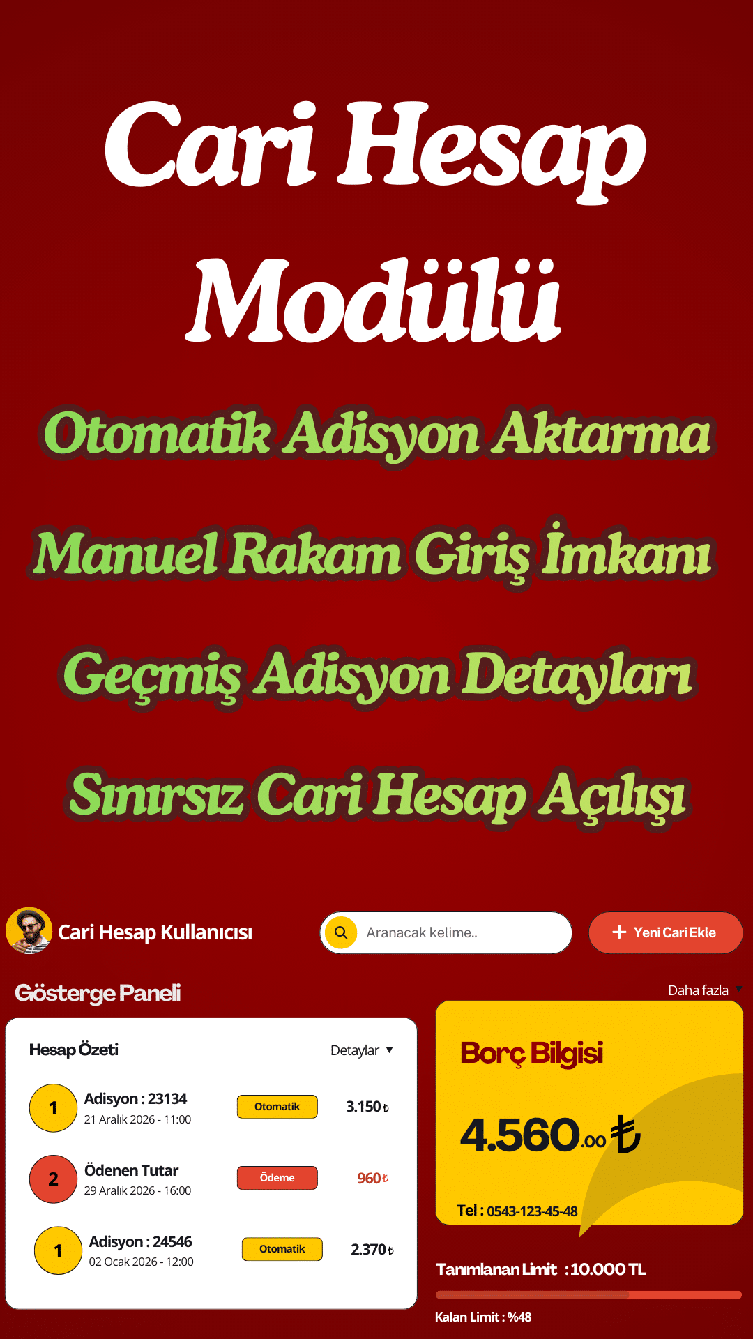 Müşterilerinizin ve personellerinizin harcamalarını takip edin. Geçmiş Adisyonları ulaşabilir, ödeme alabilir hesapları yönetebilirsiniz.
